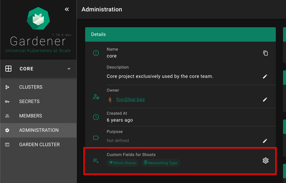 Custom shoot fields can be defined per project by specifying metadata.annotations["dashboard.gardener.cloud/shootCustomFields"]. The following is an example project yaml:
