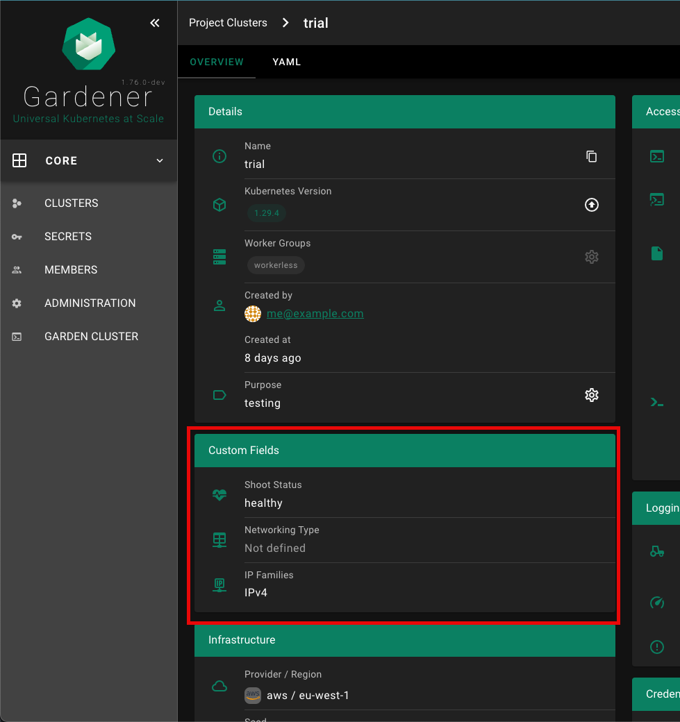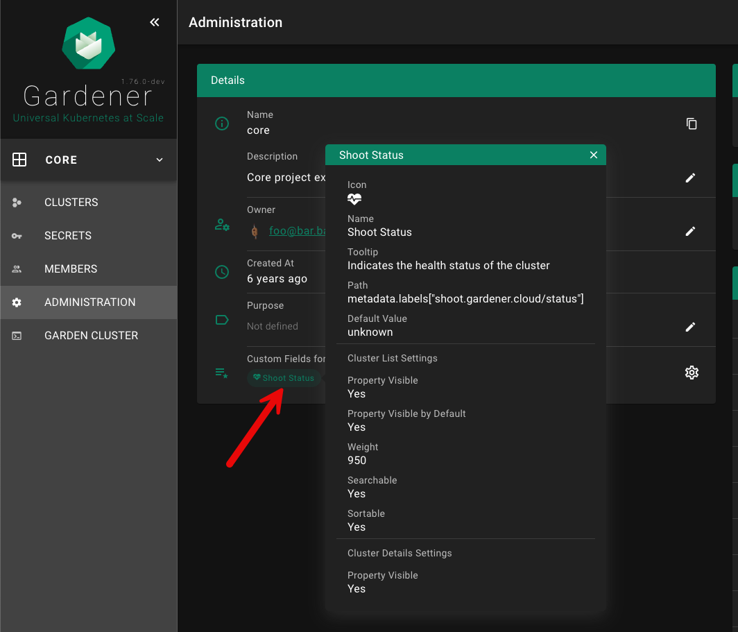 The Dashboard supports custom shoot fields, which can be configured to be displayed on the cluster list and cluster details page. Custom fields do not show up on the ALL_PROJECTS page.