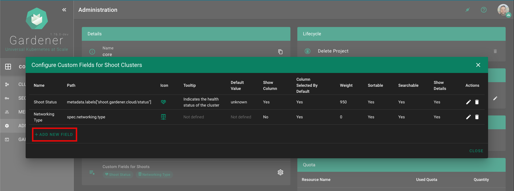 Configure Custom Fields for Shoot Clusterspanel, click on the+ ADD NEW FIELDbutton.