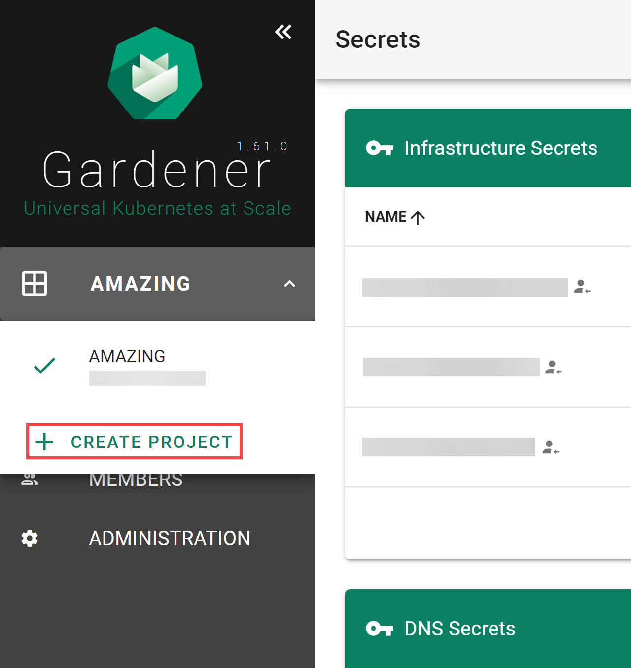 Logon to the Gardener Dashboard and choose CREATE YOUR FIRST PROJECT.