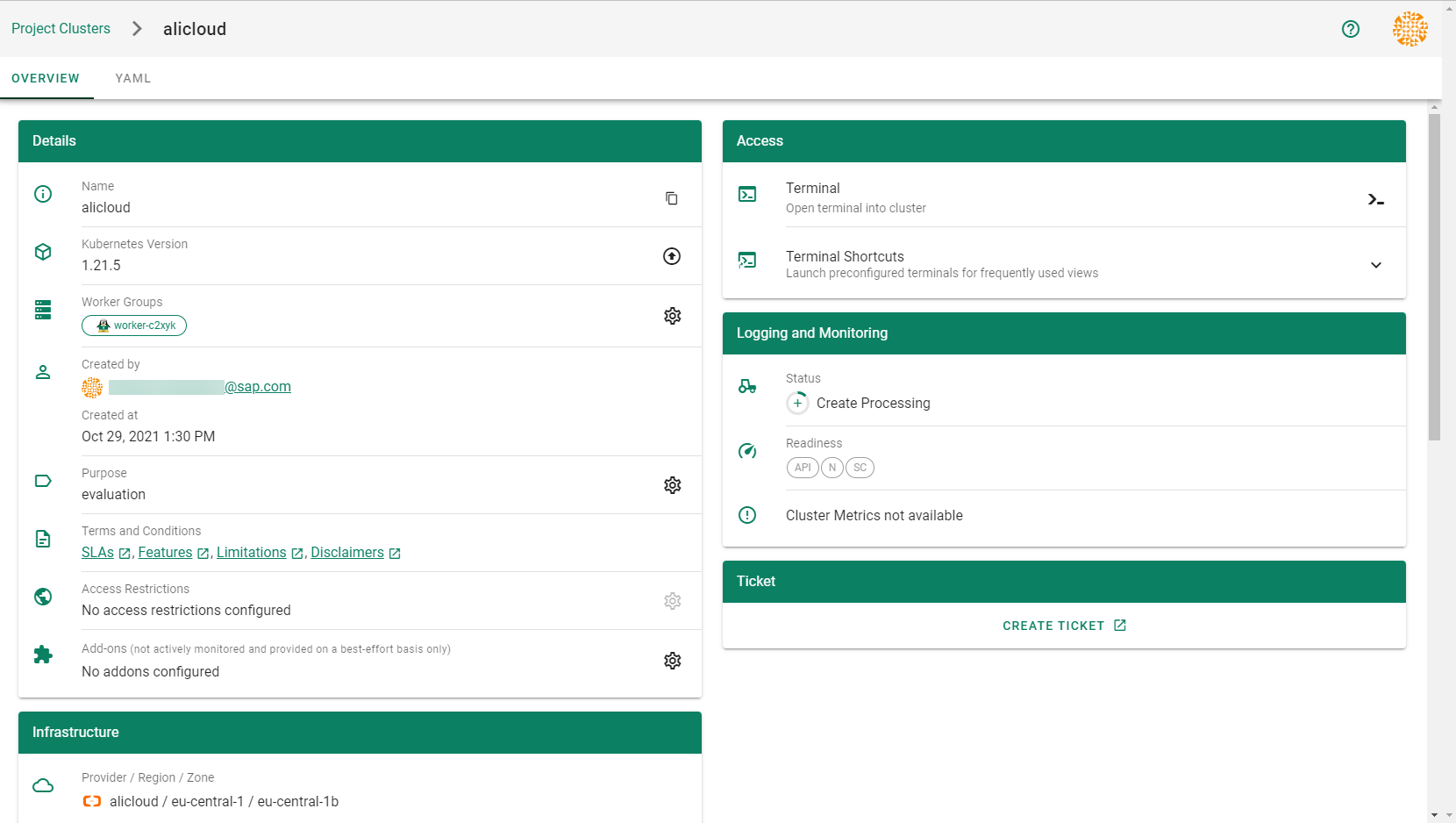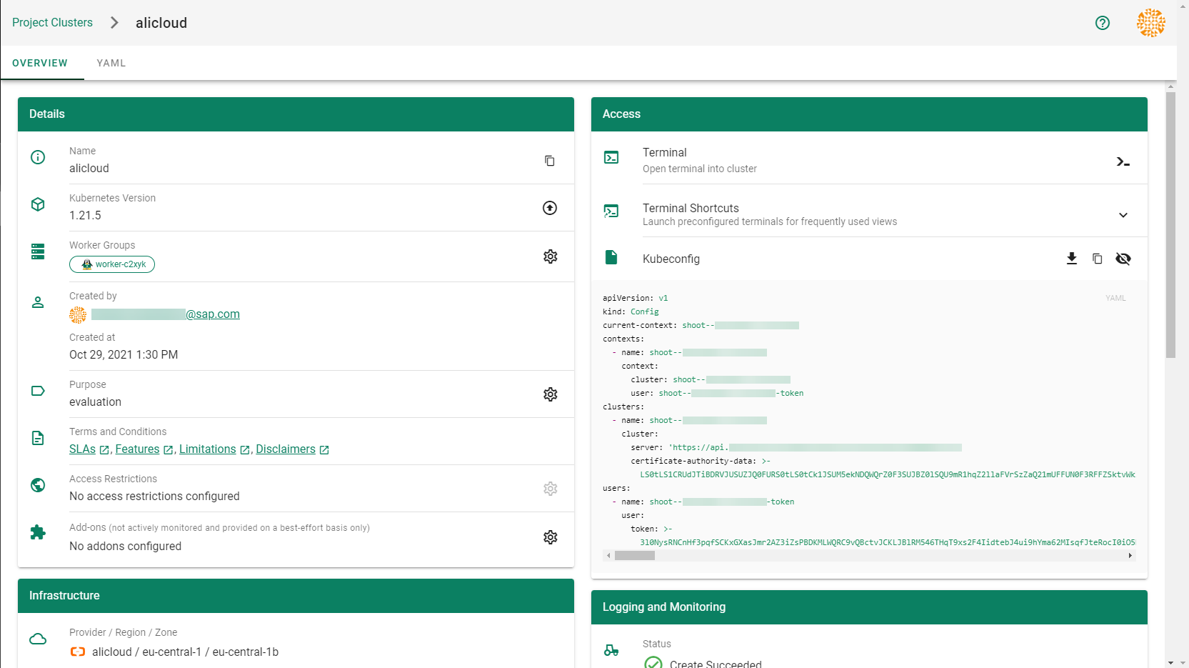 After completing the steps in this tutorial, you will be able to see and download the kubeconfig of your cluster. With it you can create shoot clusters on Alibaba Cloud.